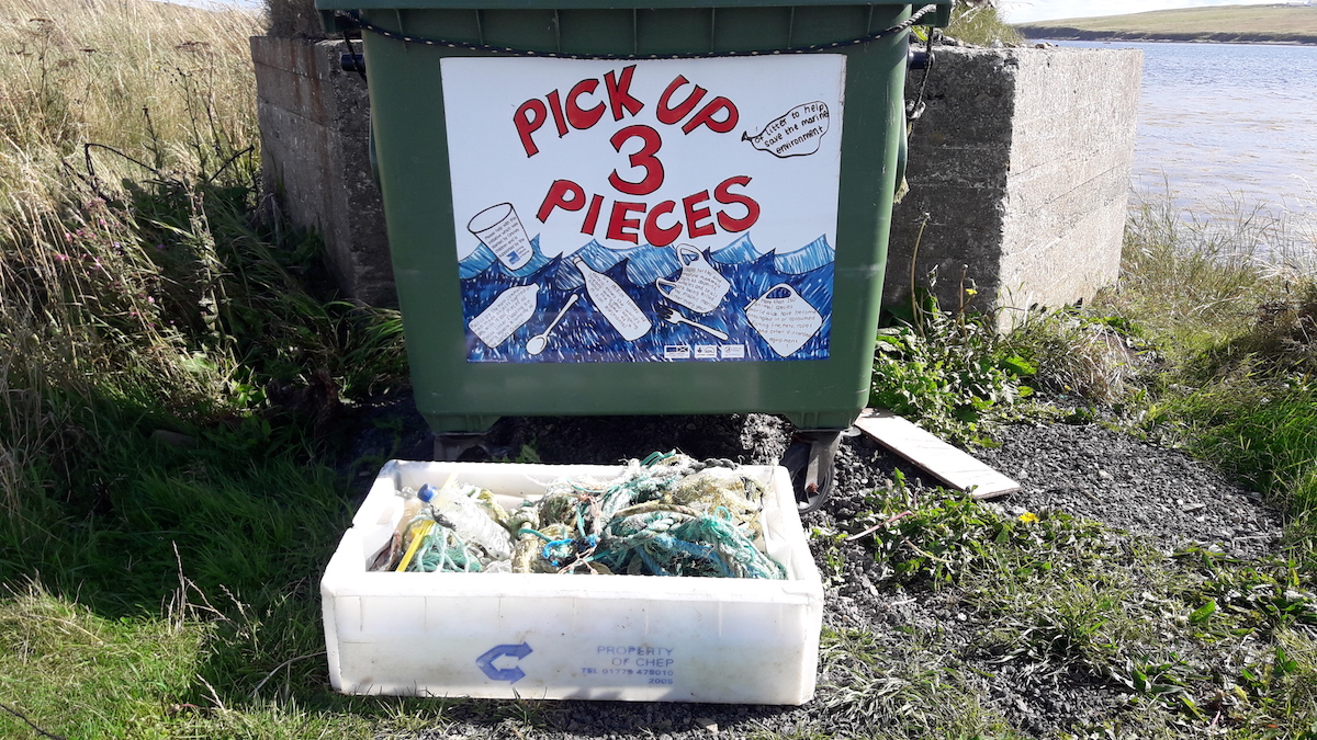 Schön, wenn wir dann sehen, dass es auch anders geht - mit kleinen Initiativen vor Ort. In Nord Schottland beispielsweise fanden wir auf South Walls, einem der dünn besiedelten Eilande der Orkney Inseln, die Intitiative „Bring three pieces“ mit eigens dafür bereitgestelltem Müllcontainer. Wir haben uns erlaubt ein wenig mehr zu sammeln.